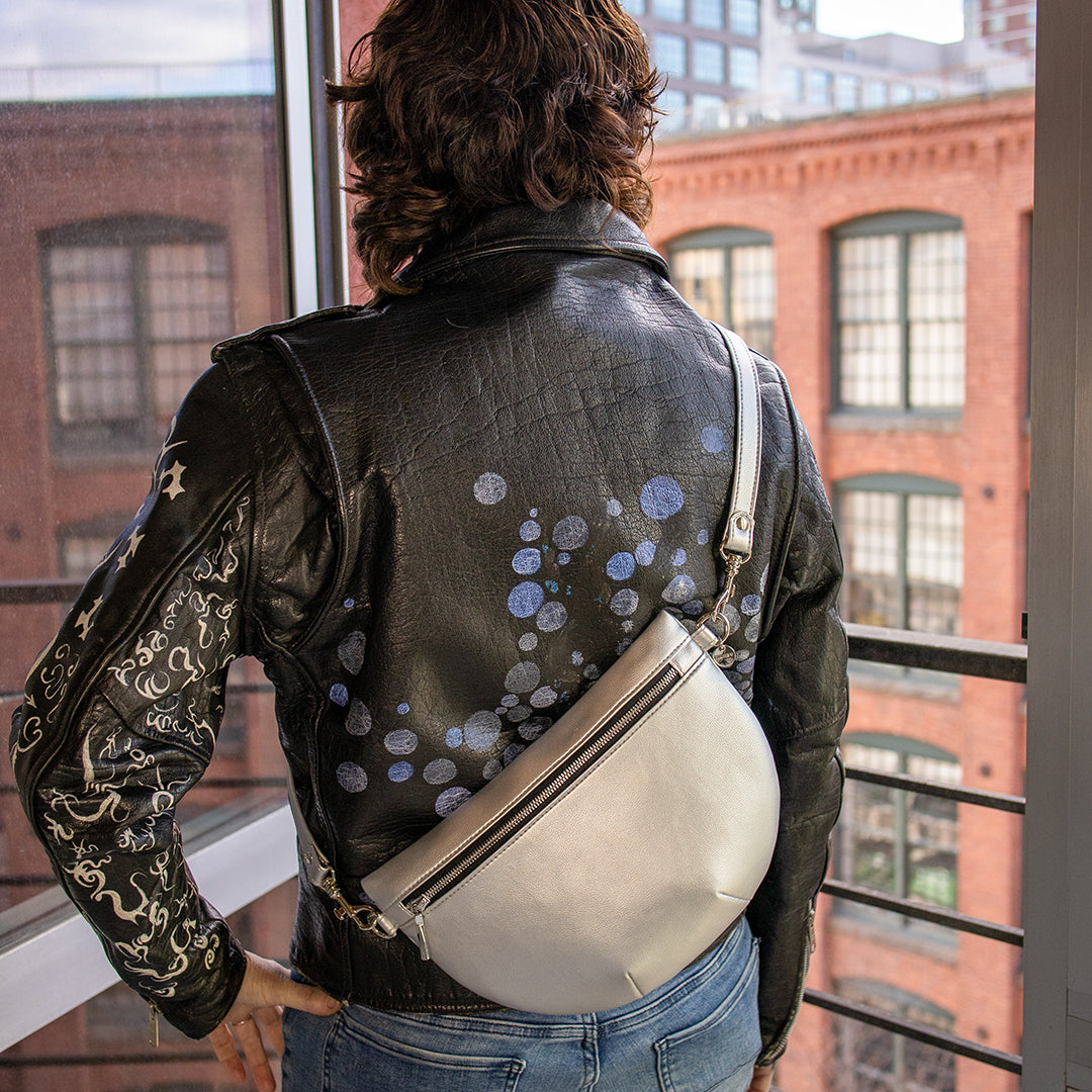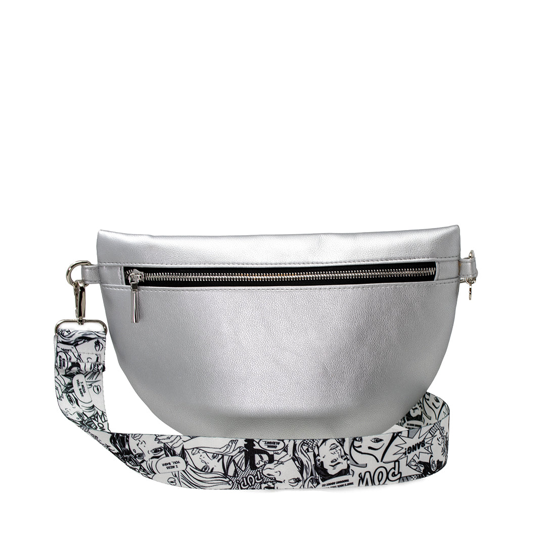 We love silver as a neutral with a little something extra. This crossbody pouch can be worn in front or back or as a fanny pack. Try swapping out the silver strap for this fun and unique comic book print adjustable crossbody strap. Silver finish Italian vegan leather with poly cotton twill lining. Metal zipper closure.