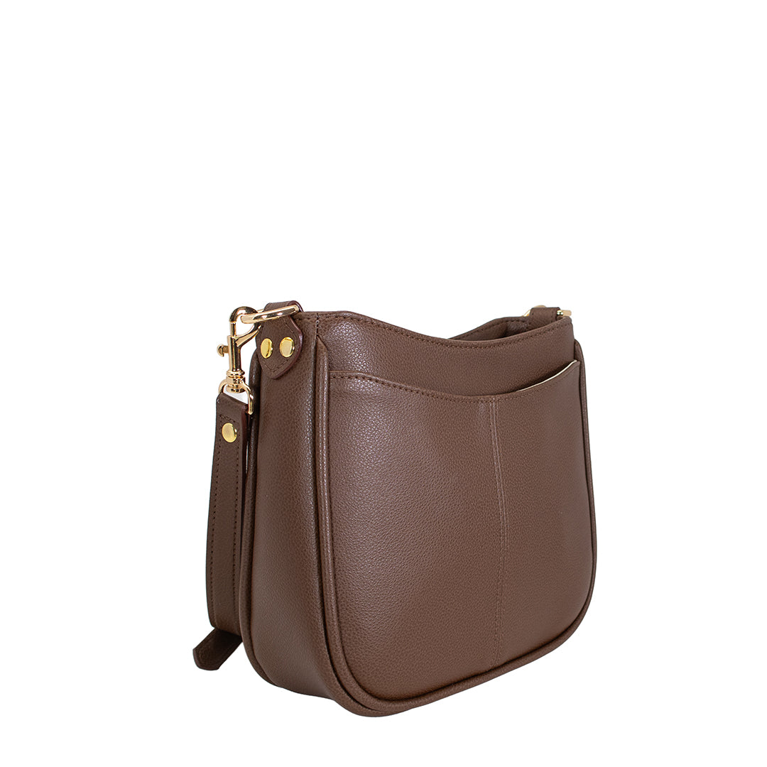 Crafted from premium Italian pebbled vegan leather, the bag features a secure top zipper, a convenient exterior slip pocket for quick access, and an interior zip pocket to keep essentials organized. Subtle piping accents the curved shape, adding structure and durability without excess.